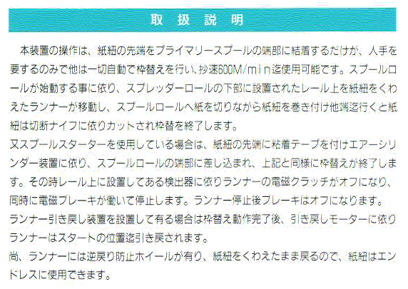 取扱の 潟nラフク 様 会社清算の為、直接お問い合わせ下さい。 ポープリール枠替装置 各画像はクリックすると大きくなります。 戻って来るには[戻る]ボタンか[ジャンプ][戻る]を押してください。 パンフレットの表紙 ランナー(左勝手) 本製品の動作説明 本製品の特徴 取付け側面図 取付け正面図 製品紹介へ戻る 羽衣機工のトップに戻る